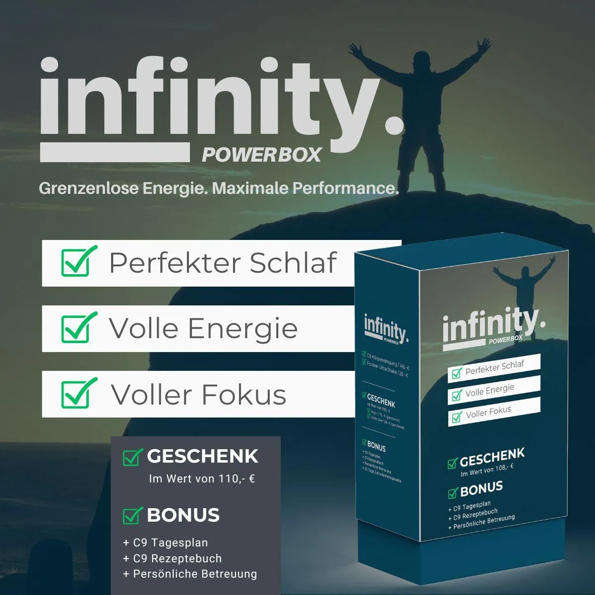 Grenzenlose Energie & nachhaltige Power: „Infinity“ steht für unerschöpfliche Kraft und Ausdauer. Die Box liefert eine nachhaltige Energiequelle, die nicht nur kurzfristig pusht, sondern langfristig Leistungsfähig-keit und Wohlbefinden steigert – ohne Koffein-Crashs oder künstliche Booster.